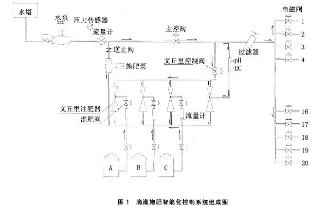 滴灌施肥智能化控制系統(tǒng)由中心控制計算機、系統(tǒng)首部裝置、田間電磁閥和控制電纜、滴灌管網系統(tǒng)組成。系統(tǒng)組成見圖1。