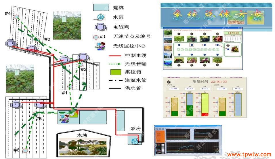 根據(jù)無線網(wǎng)絡獲取的植物實時的生長環(huán)境信息,如通過各個類型的傳感器可監(jiān)測土壤水分、土壤溫度、空氣溫度、空氣濕度、光照強度、植物養(yǎng)分含量等參數(shù)。其它參數(shù)也可以選配,如土壤中的PH值、電導率等等。信息收集、負責接收無線傳感匯聚節(jié)點發(fā)來的數(shù)據(jù)、存儲、顯示和數(shù)據(jù)管理,實現(xiàn)所有基地測試點信息的獲取、管理、動態(tài)顯示和分析處理以直觀的圖表和曲線的方式顯示給用戶,并根據(jù)以上各類信息的反饋對農(nóng)業(yè)園區(qū)進行自動灌溉、自動降溫、自動卷模、自動進行液體肥料施肥、自動噴藥等自動控制。