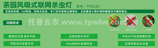 ? ? 托普茶園專用殺蟲燈利用光近距離、波遠(yuǎn)距離引誘害蟲成蟲撲燈,主要誘殺茶園中的葉蟬、金龜以及眾多的鱗翅目害蟲,利用LED窄波,保護(hù)天敵。設(shè)備獨(dú)有的遠(yuǎn)程控制功能可在GIS地圖在線查看區(qū)域內(nèi)殺蟲燈工作狀況、開關(guān)燈情況、設(shè)備預(yù)警,無需跑到茶園管理,該設(shè)備的引入,提高了古丈縣茶園綠色管控水平,為促進(jìn)古丈縣茶葉產(chǎn)業(yè)持續(xù)快速發(fā)展,為茶農(nóng)增收、茶葉提質(zhì)提供了有效途徑。