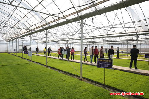 圖為:交流會(huì)人員在參觀智能化育秧大棚