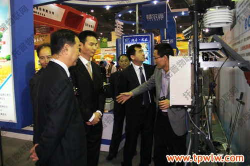 圖為:業(yè)界領(lǐng)導(dǎo)在托普展位了解固定式無線土壤墑情檢測(cè)系統(tǒng)