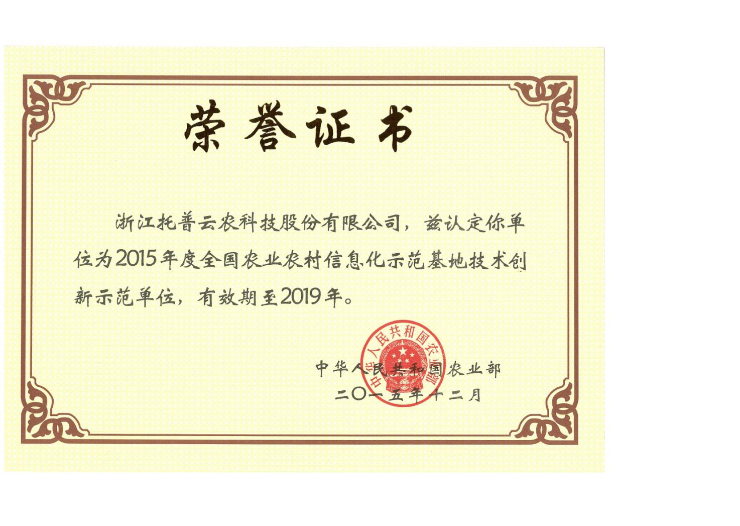 2015年12月9日,農(nóng)業(yè)部發(fā)文公布《農(nóng)業(yè)部關(guān)于認(rèn)定2015年度全國農(nóng)業(yè)農(nóng)村信息化示范基地的通知》,浙江托普云農(nóng)科技股份有限公司獲批技術(shù)創(chuàng)新型示范單位?!锻ㄖ芬蟾魇痉痘?,秉持創(chuàng)新、協(xié)調(diào)、綠色、開放、共享的發(fā)展理念,積極推進(jìn)“互聯(lián)網(wǎng)+”現(xiàn)代農(nóng)業(yè)行動(dòng),大力發(fā)展農(nóng)業(yè),切實(shí)抓好農(nóng)業(yè)電子商務(wù)、農(nóng)業(yè)物聯(lián)網(wǎng)、農(nóng)業(yè)農(nóng)村大數(shù)據(jù)、農(nóng)業(yè)信息服務(wù)等重點(diǎn)工作,大膽探索創(chuàng)新,充分發(fā)揮示范引領(lǐng)作用,為推進(jìn)農(nóng)業(yè)現(xiàn)代化作出新貢獻(xiàn)。