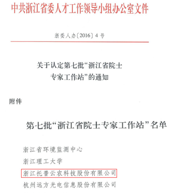7月25日,中共浙江省委人才工作領導小組辦公室公布了第七批“浙江省院士專家工作站”名單,此次共有22家單位上榜,杭州市2家。浙江省托普云農(nóng)科技股份有限公司(以下簡稱“托普云農(nóng)”)成為浙江農(nóng)業(yè)信息化領域內第一家獲此殊榮的企業(yè)。
