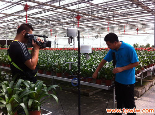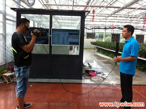 記者:所謂物聯(lián)網(wǎng),其實(shí)簡(jiǎn)單的說(shuō)就是物物相連,互相感知。大家看我身后的一組探頭(托普儀器固定式無(wú)線農(nóng)業(yè)氣象綜合監(jiān)測(cè)站),包括這個(gè)是測(cè)量溫度的,這個(gè)是測(cè)量土壤墑情的,上面還有測(cè)量二氧化碳濃度的,測(cè)量光照強(qiáng)度的。那這些測(cè)量數(shù)據(jù)都會(huì)上傳到我身后的中央控制室內(nèi)的計(jì)算機(jī)里,通過計(jì)算機(jī)的計(jì)算,再控制風(fēng)扇、噴灌…這些設(shè)備的運(yùn)轉(zhuǎn)。