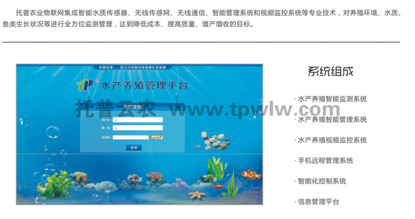 水產(chǎn)養(yǎng)殖監(jiān)控系統(tǒng)是一套物聯(lián)網(wǎng)為核心,貫穿整個(gè)養(yǎng)殖過程,科技化、智能化、便捷性、低成本、高收益的水產(chǎn)養(yǎng)殖系統(tǒng),它的應(yīng)用標(biāo)志著經(jīng)驗(yàn)養(yǎng)殖的方式正在逐漸成為歷史,科技養(yǎng)殖的時(shí)代開始到來。托普云農(nóng)水產(chǎn)養(yǎng)殖監(jiān)控系統(tǒng)利用各種水質(zhì)傳感器測(cè)驗(yàn)PH、溶解氧、溫度等重要的水質(zhì)數(shù)據(jù),并及時(shí)作出調(diào)整,使水質(zhì)達(dá)到最佳狀態(tài)。