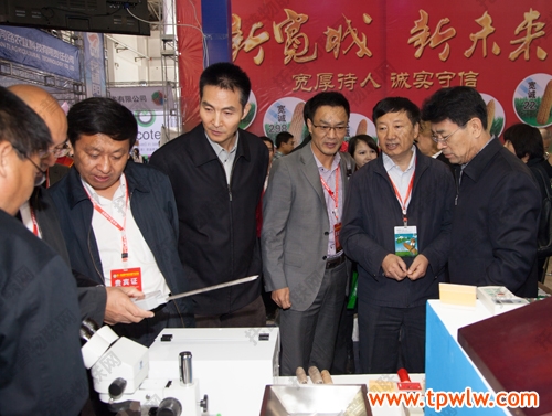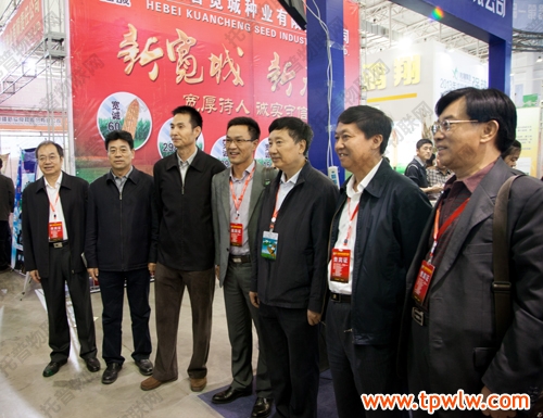 圖為:托普總經(jīng)理陳渝陽(yáng)先生引領(lǐng)農(nóng)業(yè)部種子管理局張延秋局長(zhǎng)(右二),吉林農(nóng)委李國(guó)強(qiáng)主任,全國(guó)農(nóng)技推廣服務(wù)中心黨委杭大鵬(右四)書(shū)記等領(lǐng)導(dǎo)參觀公司展臺(tái)