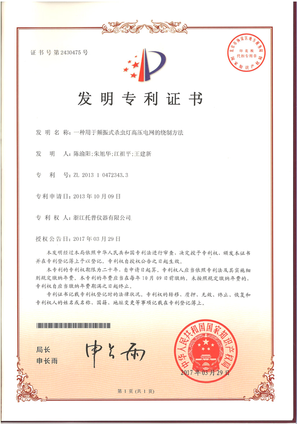 - 托普云農(nóng)又喜獲發(fā)明專利發(fā)表日期:2017-04-14 來源:托普云農(nóng) 瀏覽次數(shù):4416次近日,我司托普云農(nóng)又喜獲一項(xiàng)發(fā)明專利。據(jù)悉,該發(fā)明專利名稱為“一種用于頻振式殺蟲燈高壓電網(wǎng)的繞制方法”,發(fā)明專號(hào)為ZL201310472343.3。相較于傳統(tǒng)的殺蟲燈繞制方法,“一種用于頻振式殺蟲燈高壓電網(wǎng)的繞制方法”是一種用專門設(shè)計(jì)的螺旋繞線機(jī)實(shí)現(xiàn)殺蟲燈高壓電網(wǎng)繞線的方法。該發(fā)明專利于2013年10月9日向國家知識(shí)產(chǎn)權(quán)局申請,并于2017年3月29日正式得到授權(quán)。據(jù)業(yè)內(nèi)專家評價(jià),該專利由于電網(wǎng)間距由螺桿螺距保證,使得繞制后的電網(wǎng)間距均勻一致。此外,繞制方法操作方便,繞制效率高且繞線緊致不易松落造成短路,具有良好的普及運(yùn)用價(jià)值。
