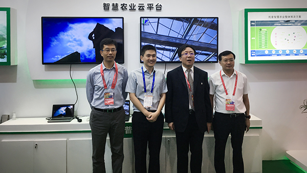 托普云農(nóng)營(yíng)銷(xiāo)總監(jiān)陳曦(左二)向中國(guó)電信集團(tuán)公司政企客戶事業(yè)部總經(jīng)理梁寶?。ㄗ笠唬┙榻B智慧農(nóng)業(yè)的應(yīng)用