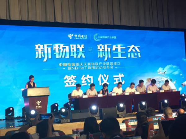 中國電信重慶天翼物聯(lián)產(chǎn)業(yè)聯(lián)盟成立暨NB-IoT商用啟動發(fā)布會現(xiàn)場的簽約儀式