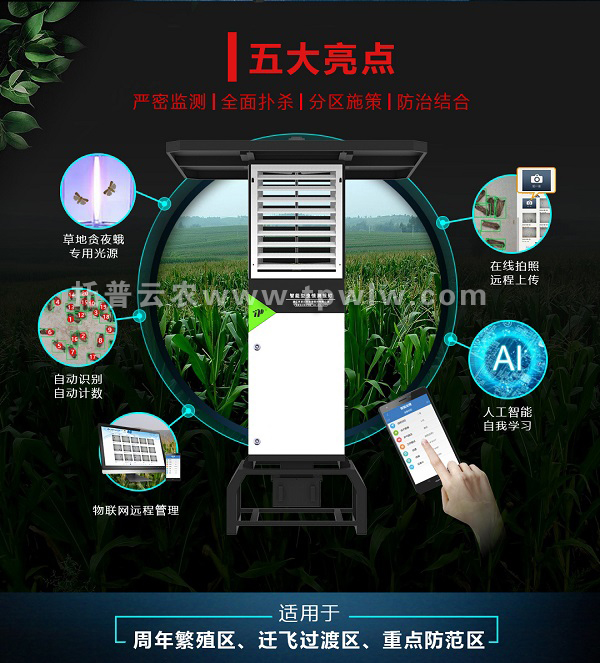 為了預(yù)防草地貪夜蛾的入侵,必須用測報燈做好監(jiān)測。托普云農(nóng)研發(fā)的智能蟲情測報燈全新升級重磅上線,具有AI人工智能自我學(xué)習(xí)功能,采用草地貪夜蛾專用光源,可自動識別自動計數(shù),真正做到嚴(yán)密監(jiān)測,全面撲殺。在線拍照遠(yuǎn)程上傳,可通過Web或APP隨時隨地聯(lián)網(wǎng)管理。