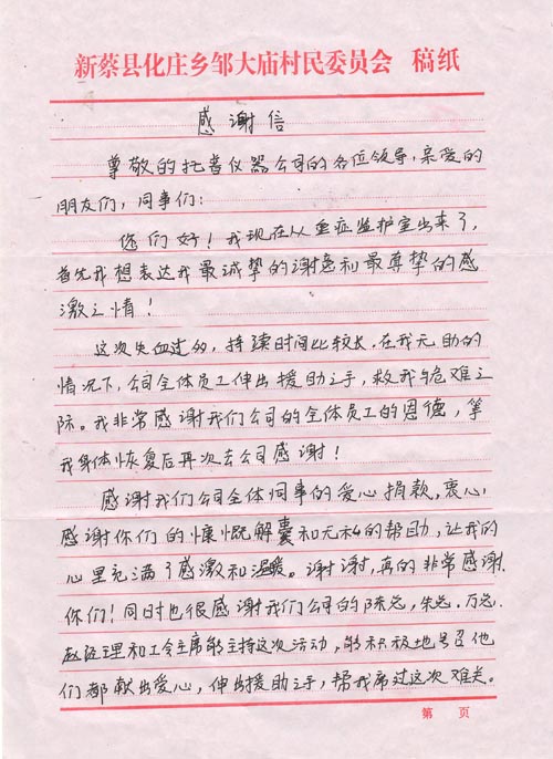 1月15日,公司收到劉學(xué)義寫來的信,信中他告訴托普家人他的病情已好轉(zhuǎn),術(shù)后已由重癥監(jiān)護室轉(zhuǎn)入普通病房,等待觀察與休養(yǎng)。長長的一封信,給同事們帶來了喜悅的消息,也傾訴著他對托普家人的深深謝意!
