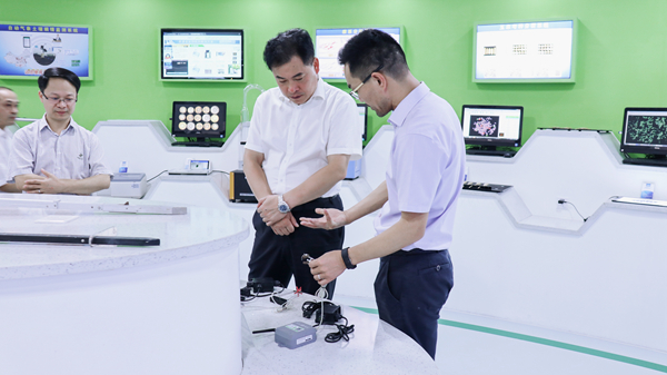 在托普云農(nóng)展廳內(nèi),唐冬壽副廳長(zhǎng)一行聽取了陳渝陽董事長(zhǎng)關(guān)于公司使命愿景、發(fā)展歷程、實(shí)踐案例等相關(guān)內(nèi)容的匯報(bào)。