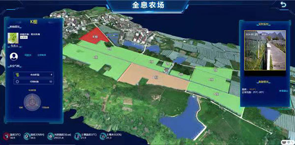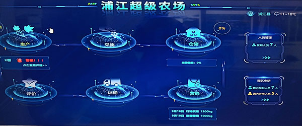 作為智慧農(nóng)業(yè)的升級版本,“超級農(nóng)場”項目對生產(chǎn)經(jīng)營管理等每一個環(huán)節(jié),都進行了嚴(yán)格的監(jiān)管,數(shù)據(jù)采集,實時監(jiān)測。通過無人機的航拍,實現(xiàn)了對整個農(nóng)場的3D建模,把整個農(nóng)場分成A—K,差不多11個區(qū)塊,然后進行區(qū)塊的數(shù)字化監(jiān)控。一塊電子顯示屏就可看到農(nóng)場的所有狀況,葡萄園11個鋼架大棚所有環(huán)境信息,包括溫度、濕度、土壤酸堿值、光照等情況都呈現(xiàn)在屏幕上。另外,葡萄園里各處分布了多少攝像頭,有多少在職人員,多少外來人員,也都能一目了然。