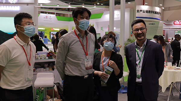 全國(guó)農(nóng)業(yè)技術(shù)推廣服務(wù)中心主任魏?jiǎn)⑽模ㄗ蠖?、園藝處處長(zhǎng)周澤宇(左一)、副處長(zhǎng)冷楊(右一)參觀托普云農(nóng)展位
