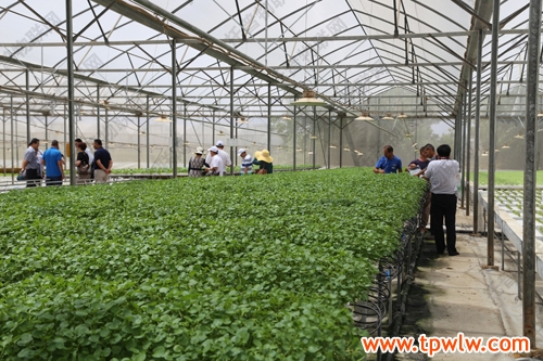 圖為:考察團(tuán)考察無(wú)土栽培種植技術(shù)