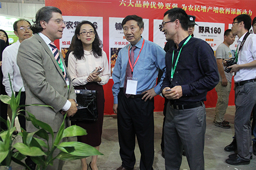 農(nóng)業(yè)部種子局局長(zhǎng)張延秋、副局長(zhǎng)馬淑萍一行還帶領(lǐng)前來(lái)參加中國(guó)-阿根廷種業(yè)交流峰會(huì)的阿根廷代表團(tuán)參觀了托普云農(nóng)展區(qū)。阿根廷國(guó)家種子研究所董事會(huì)主席拉威諾勒 萊英姆多農(nóng)業(yè)工程師仔細(xì)觀摩了公司所展出的種子檢驗(yàn)儀器和系統(tǒng),并與陳渝陽(yáng)總經(jīng)理進(jìn)行交流。