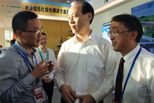 農交會期間,農業(yè)部余欣榮副部長、農業(yè)部市場與經(jīng)濟信息司王小兵副司長一行蒞臨托普展區(qū)參觀指導。余副部長表示,農業(yè)物聯(lián)網(wǎng)技術應用除了現(xiàn)有的系統(tǒng)及硬件以外,還要與射頻技術緊密結合,提高物聯(lián)網(wǎng)的科技含量。屈冬玉副部長和斯洛文尼亞副總理一行也蒞臨托普展區(qū),并與陳渝陽總經(jīng)理親切交談。雙方就農業(yè)物聯(lián)網(wǎng)的研發(fā)推廣以及落地應用等問題進行交流。
