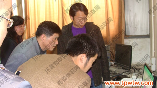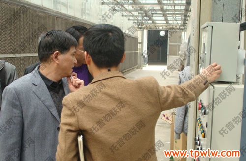 圖為:托普工作人員詳細(xì)講解托普物聯(lián)網(wǎng)系統(tǒng)的控制原理,左一為傳化陳堅總經(jīng)理,左二為戴守勤處長,右一為傳化榮松主任
