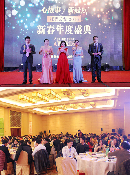 羊隨新風辭舊歲,金猴獻瑞迎新春。2016年1月30日,“新起點 新起航——托普云農(nóng)2015年度總結表彰大會暨2016迎新春聯(lián)歡會”在杭州海外?!ぜ{川大酒店隆重舉行。300余名托普家人共聚一堂,回顧這一年所取得的成績,規(guī)劃2016年新的奮斗目標,共同迎接歡樂幸福的農(nóng)歷新年。