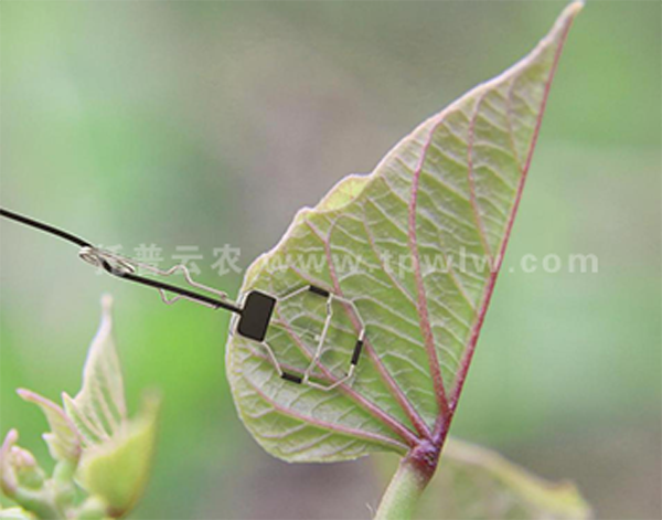 2.打開上、下夾使傳感器與葉子固定,且需要將傳感器探頭(電熱調節(jié)器)置于葉子背陽面且充分接觸,安裝時應避免經常按、壓探頭,如野蠻操作可能導致?lián)p壞。