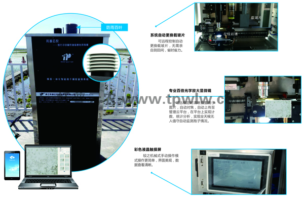 ?????? 遠程拍照式孢子捕捉儀采用了條形碼識別追溯技術、精度限位技術、自動智能化聚焦技術、3G無線傳輸控制技術等該客機手段,全天候?qū)崟r采集分析,節(jié)時省力??蛇h程拍攝孢子圖片上傳至管理平臺,實現(xiàn)農(nóng)業(yè)病菌孢子濃度測試數(shù)字化,使監(jiān)測通過互聯(lián)網(wǎng)及時了解病害的發(fā)生、發(fā)展情況以及病害的分布區(qū)域,及時預防農(nóng)業(yè)病害的發(fā)生和蔓延。