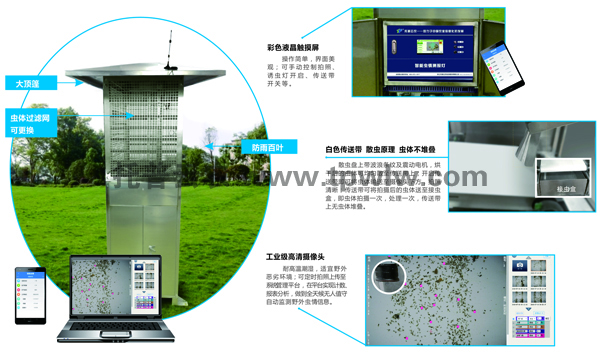 ?????? 遠程拍照式蟲情測報燈可無公害誘捕殺蟲,綠色環(huán)保,同時利用GPRS/3G移動無線網(wǎng)路,定時采集現(xiàn)場圖像,自動上傳到物聯(lián)網(wǎng)監(jiān)控服務平臺,平臺自動記錄每天采集數(shù)據(jù),形成蟲害數(shù)據(jù)庫??捎脠D表、列表形式展現(xiàn)給農(nóng)業(yè)專家進行遠程診斷。工作人員可隨時遠程了解田間蟲情狀況,制定防治措施。