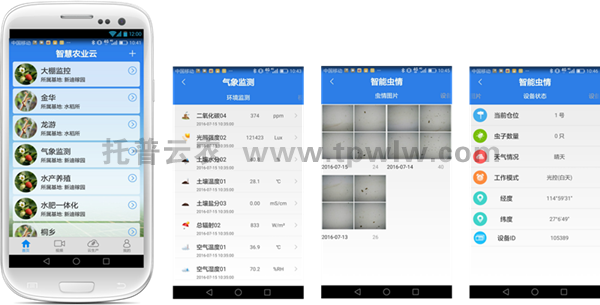 ?????? 托普農(nóng)業(yè)“四情”監(jiān)測系統(tǒng)/農(nóng)林“四情”監(jiān)測預警系統(tǒng)由小型氣象站、蟲情測報燈、苗情/災情攝像機、作物生理生態(tài)監(jiān)測儀以及預警預報系統(tǒng)、專家系統(tǒng)、信息管理平臺組成。各級用戶通過網(wǎng)頁、手機即可查詢田間蟲情、苗情、病情、環(huán)境數(shù)據(jù)。系統(tǒng)聯(lián)合作物管理知識、作物圖庫、災害指標等模塊,對作物實時遠程監(jiān)測與診斷,提供智能化、自動化管理決策,是農(nóng)業(yè)技術人員的“千里眼”和“聽診器”。