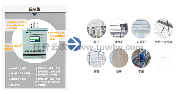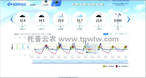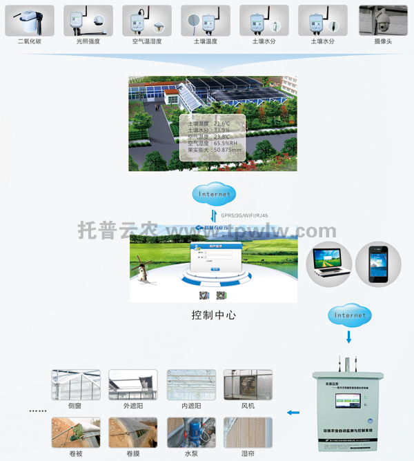 對(duì)于規(guī)模化的溫室大棚種植而言,單靠人工管理需要大量人手,耗力費(fèi)時(shí),并且存在難以避免的人工誤差。托普物聯(lián)網(wǎng)智能溫室控制系統(tǒng)采集溫室內(nèi)的空氣溫濕度、土壤水分、土壤溫度、二氧化碳、光照強(qiáng)度等實(shí)時(shí)環(huán)境數(shù)據(jù),通過(guò)中繼節(jié)點(diǎn)傳輸?shù)娇刂浦行模芍行钠脚_(tái)系統(tǒng)將最新監(jiān)測(cè)數(shù)據(jù)與預(yù)先設(shè)定適合農(nóng)作物生長(zhǎng)的環(huán)境參數(shù)與進(jìn)行比較,如發(fā)現(xiàn)傳感器監(jiān)測(cè)到的數(shù)據(jù)與預(yù)設(shè)數(shù)值有了偏差,計(jì)算機(jī)會(huì)自動(dòng)發(fā)出指令,智能啟動(dòng)與系統(tǒng)相連接的通風(fēng)機(jī)、遮陽(yáng)、卷被、加濕、澆灌等設(shè)備進(jìn)行工作,直到大棚內(nèi)環(huán)境數(shù)據(jù)達(dá)到系統(tǒng)預(yù)設(shè)的數(shù)據(jù)范圍之內(nèi),相關(guān)設(shè)備才會(huì)停止工作。