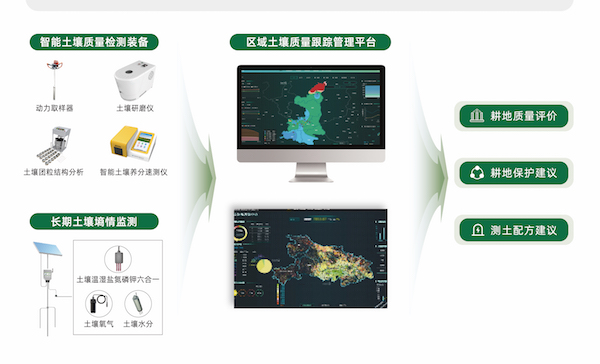 農(nóng)田耕地質(zhì)量監(jiān)測管理在土地平整、農(nóng)田整治的基礎(chǔ)上,利用耕地質(zhì)量監(jiān)測智能化裝備與土壤傳感器體系采集土壤理化相關(guān)指標、土壤含水量、區(qū)域農(nóng)業(yè)氣象等數(shù)據(jù),實現(xiàn)田間地情、肥情、環(huán)情、墑情的監(jiān)測分析。聯(lián)動應(yīng)用區(qū)域土壤質(zhì)量跟蹤管理平臺,為耕地監(jiān)管單位建立數(shù)字化管理體系,實現(xiàn)高標農(nóng)田耕地質(zhì)量的長效化、動態(tài)化、智能化監(jiān)測與管理。