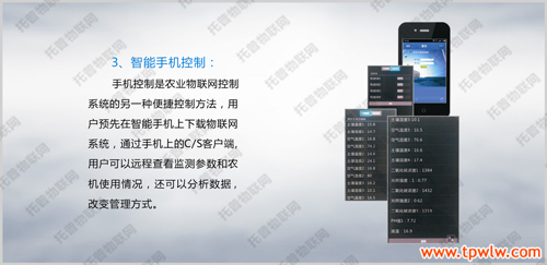 通過物聯(lián)網(wǎng)系統(tǒng)可連接傳感器采集土壤溫度、濕度、養(yǎng)分含量(N、P、K)、PH值、降水量、空氣溫濕度、氣壓、光照強度等來獲得作物生長的適宜條件,并根據(jù)參數(shù)變化實時調(diào)控或自動控制溫控系統(tǒng)、灌溉系統(tǒng)等;