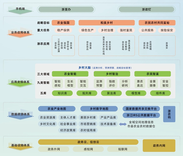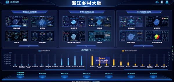 浙江省農(nóng)業(yè)農(nóng)村廳圍繞省委數(shù)字化改革決策部署,聚焦大腦監(jiān)測(cè)分析評(píng)價(jià)、預(yù)測(cè)預(yù)警和戰(zhàn)略目標(biāo)管理能力的新目標(biāo),大力推進(jìn)"浙江鄉(xiāng)村大腦 +浙農(nóng)系列應(yīng)用"體系建設(shè),迭代形成以"11153"核心構(gòu)架為支撐的"浙江鄉(xiāng)村大腦"(1個(gè)數(shù)據(jù)倉(cāng),1張全域地理信息圖,1個(gè)"浙農(nóng)碼”,5個(gè)庫(kù)為知識(shí)庫(kù)、規(guī)則庫(kù)、算法庫(kù)、模型庫(kù)和組件庫(kù),3領(lǐng)域能力為農(nóng)業(yè)智能、鄉(xiāng)村智治、農(nóng)民智富),按照'一表一圖N清單"的方法,開(kāi)發(fā)建設(shè)9個(gè)智能模塊,以數(shù)字技術(shù)助力農(nóng)業(yè)農(nóng)村現(xiàn)代化、鄉(xiāng)村振興和農(nóng)民農(nóng)村共同富裕。目前,"浙江鄉(xiāng)村大腦"已實(shí)現(xiàn)省市縣三級(jí)貫通。